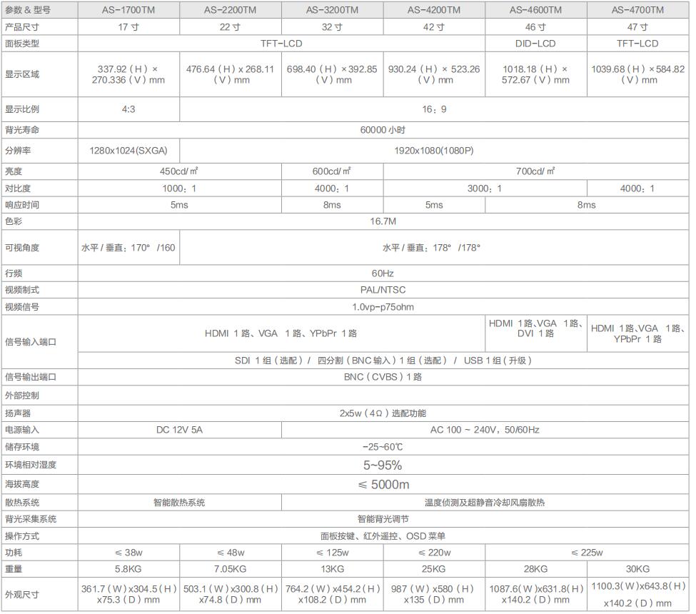 高清 LCD 拼接墙监视器产品尺寸有 17″、19″、 20″、 22″、26”、 32”、 37”、 40”、 42”、 46”、 52”、 57”、 65”、 70”、 82”全系列。 拼接墙采用业界最先进的图像处理芯片,支持驱动目前最大的 108" 单元屏,支持全高清 1080P 分辨率,画中画 功能,支持所有图像接口(S 端子、BNC、VGA、YPbPr、HDMI),拼接屏单元行(M)* 列(N)数量、尺寸均无限 制任意选择,拼接缝超窄,单边最小 3.5mm,支持多屏图像拼接,画面可整屏显示,也可分屏显示,支持虚拟屏,用户可 灵活开启窗口,定义尺寸,画面能够自由缩放、移动、漫游,不受物理接缝的限制。